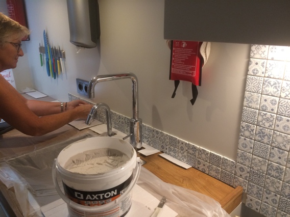 We hebben tegeltjes gevonden voor de keuken! Nee, toch maar geen Portugese, dat wordt wel erg druk. De tegels opplakken valt mee, maar het voegen is best wel een pittig werkje.