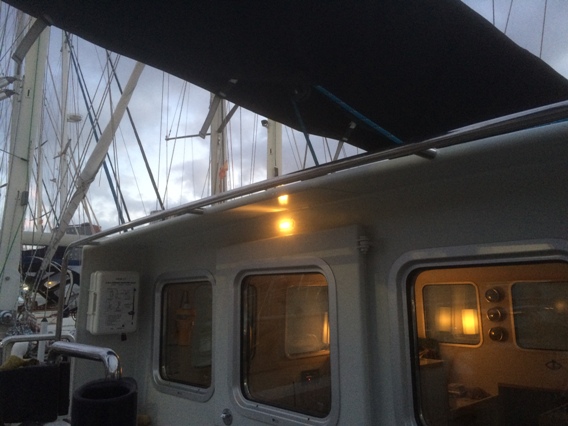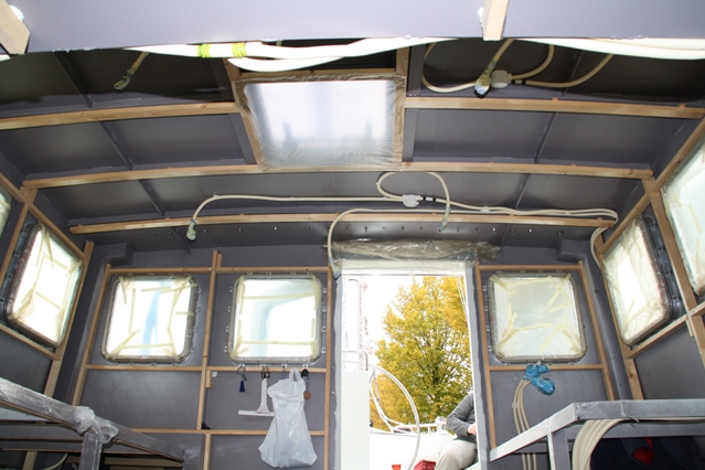 Tijdens onze wintertochten naar Terschelling bedachten we bij het zien van een Atlantic dat bij ons een lampje boven de deur ook mooi zou zijn. We hebben nog een lege buis en lichtknopje, dus dat kan gemakkelijk. Lampje mee en nu buiten alles geschilderd is gaan we aan de slag. Het gat boven de deur gaat gemakkelijk maar waar zit toch de buis naar het lichtknopje? Gelukkig hebben we de foto’s nog. Dat neemt niet weg dat toch de halve zitting van de navigatiehoek gesloopt moet worden en we er de hele dag mee bezig zijn geweest. Maar het is gelukt!