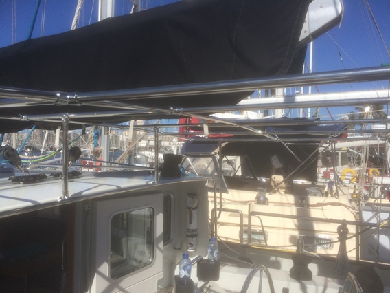 De bimini is klaar, het ijzerwerk viel mee. Maar de bekleding was een ramp en is uiteindelijk op Tenerife afgemaakt.